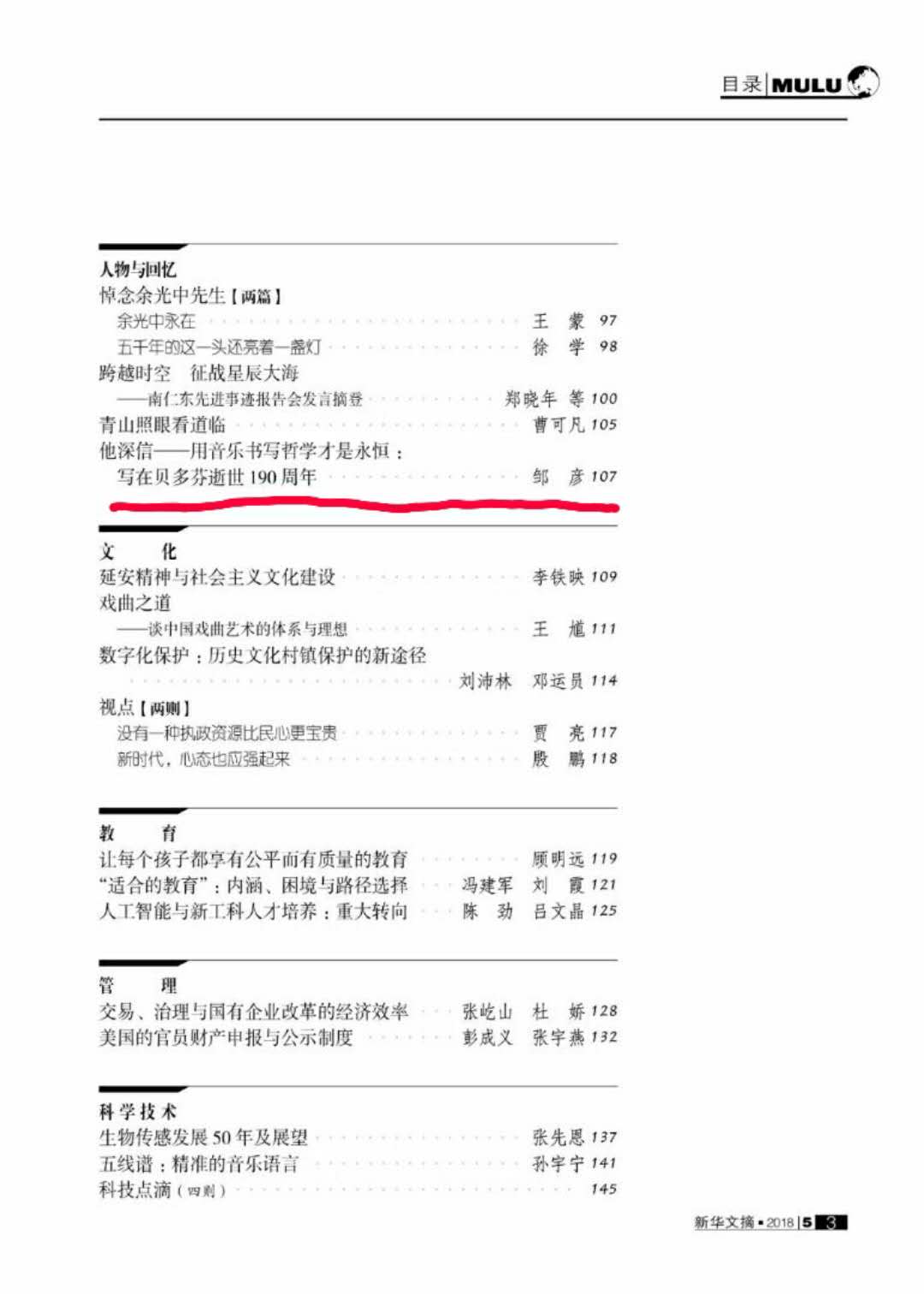 近日,华体会在线登录音乐学系邹彦教授撰写的《他深信——用音乐书写哲学才是永恒:写在贝多芬逝世190周年》一文被《新华文摘》2018年第5期全文转载。