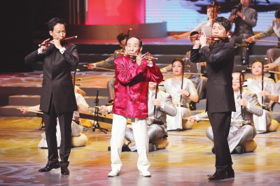2016年10月12日,在第十八届中国上海国际艺术节开幕式上,95岁高龄的笛子演奏家陆春龄(左)携弟子登台合奏《我的祖国》。