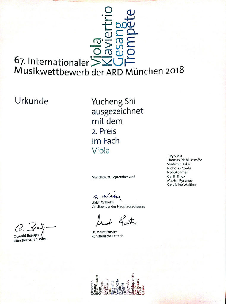 2018年9月,第67届慕尼黑国际音乐大赛(ARD)中提琴第二名