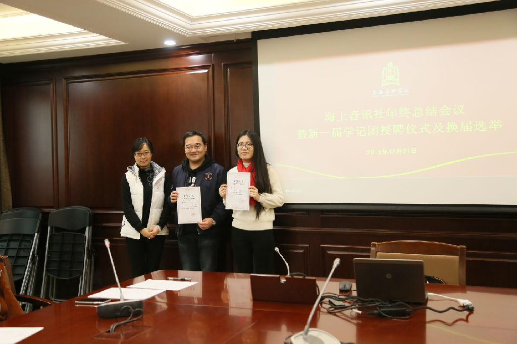 2018年12月21日中午,上音学生记者团“海上音讯社”召开2018年终总结会议,同时举行新一届学记团授聘仪式及换届选举。华体会在线登录党委常委、宣传部部长吴学霆、宣传部副部长沈黉婕和学记团各位指导老师,以及学记团全体成员参加本次会议。