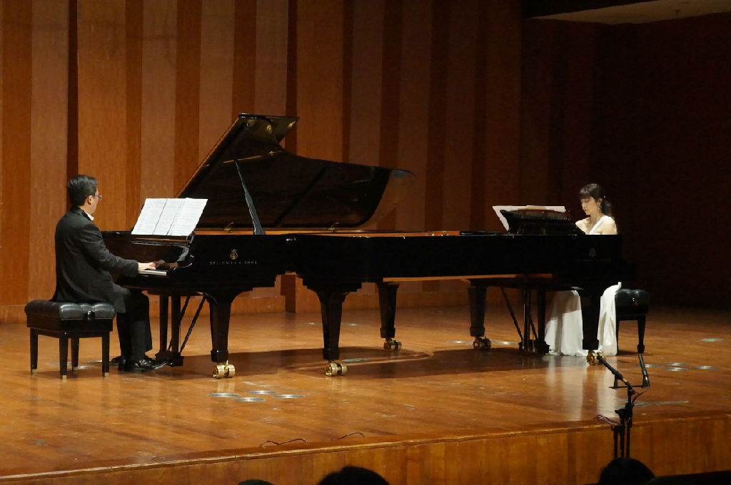 两位老师对于重奏的诠释,尽在“叠艺”二字之间,钢琴二重奏相对于独奏,音乐的织体更加丰富致密,通过两人的默契配合,表现力和感染力更是独树一帜。演出中首先表演的是勃拉姆斯的《F小调双钢琴奏鸣曲》,这部作品与爱乐者们所熟知的《F小调钢琴五重奏》实际上是同一部作品的两种呈现,钢琴二重奏以两架钢琴宽广的音域和多变的声部效果,给予了相同的旋律强有力的支撑,因而乐曲听来更加辉煌、富有交响性,将这部浪漫主义时期的室内乐精品深沉浑厚、凝重忧郁的特点表现得淋漓尽致。