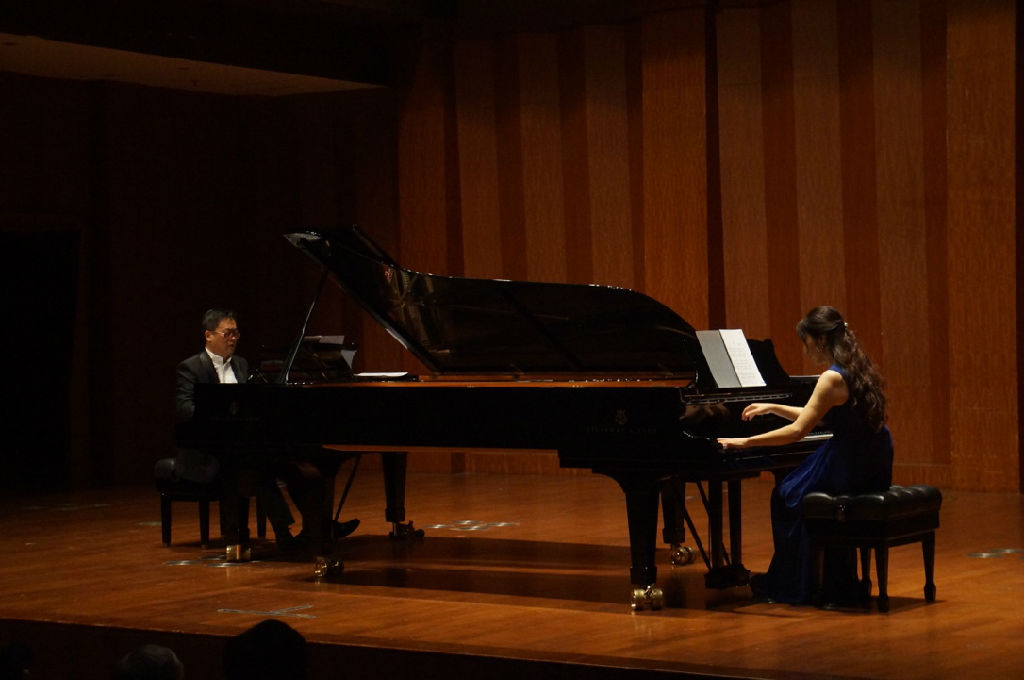首先演奏的是第一部分——古风音韵,包括了《阳关三叠》、《三六》和《昭君怨》。从古风感浓烈的唐代名曲《阳关三叠》、展现人民质朴生活的《三六》到人人皆叹惋的《昭君怨》,钢琴作为西洋乐器,通过台上两位老师成熟的演奏技巧,将民族乐器的音色钢琴化以及对不同乐器音色的模仿,使得曲目保留原曲韵味的同时与钢琴柔和的音色完美结合。