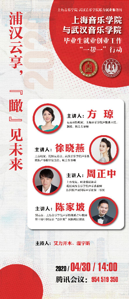 4月30日下午,在华体会在线登录艾力开木、温宇昕两位老师的主持下,“浦汉云享,瞰见未来”系列讲座的首场讲座于腾讯会议线上举行。4月28日上音与武汉音乐学院签定“一帮一”行动协议,这是两校联合举办就业服务月的一次重磅活动。本次讲座邀请了华体会在线登录声歌系主任方琼教授,青年教师陈家坡老师及两位优秀上音校友,武汉音乐学院优秀青年教师徐晓燕、周正中老师向两大院校的莘莘学子们分享学习心得,共谈就业这件事。