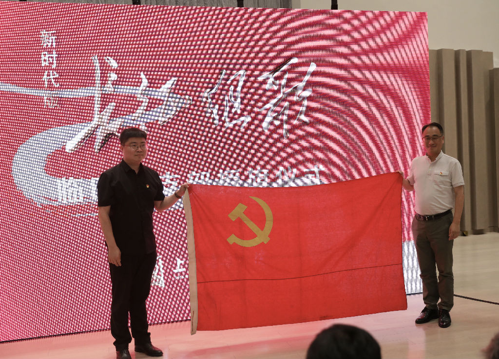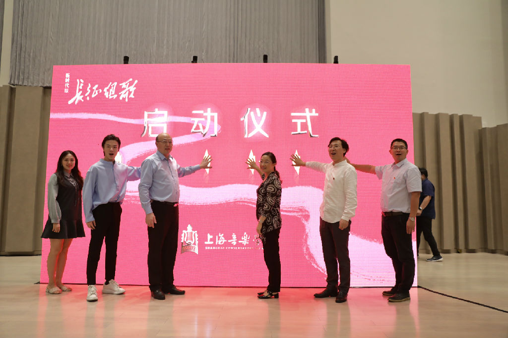 院委副书记、副院长徐卫向《长征组歌》剧组临时党支部书记郭恺授旗。嘉宾及上音领导师生代表共同触屏点亮五角星,开启新征程。