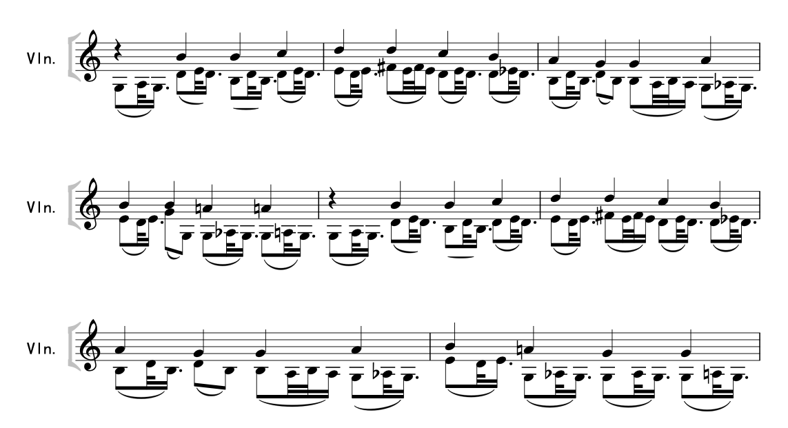 “从具有‘小唐朝’特征的《乐舞图》到《唐朝传来的声音》,可谓与贝多芬‘小贝九’《c小调钢琴合唱幻想曲》与贝九‘欢乐颂’主题乐思生成路径的不谋而合!”叶国辉教授在阐述“无伴奏小提琴曲《致贝多芬》(2020)的创作体会”之际非常感慨;此外,唐朝音乐“酒胡子”与“小贝九”均以纯五度音程作为乐曲开头,因而充满了“和”与“合”的深层意趣。小提琴演奏家黄蒙拉以极其精湛的演奏技艺,诠释了叶国辉教授的《致贝多芬》,这部作品在最后的部分,将唐朝音乐《酒胡子》和贝多芬《欢乐颂》的主题,以极度精密的形态在一把小提琴上同时呈现!
