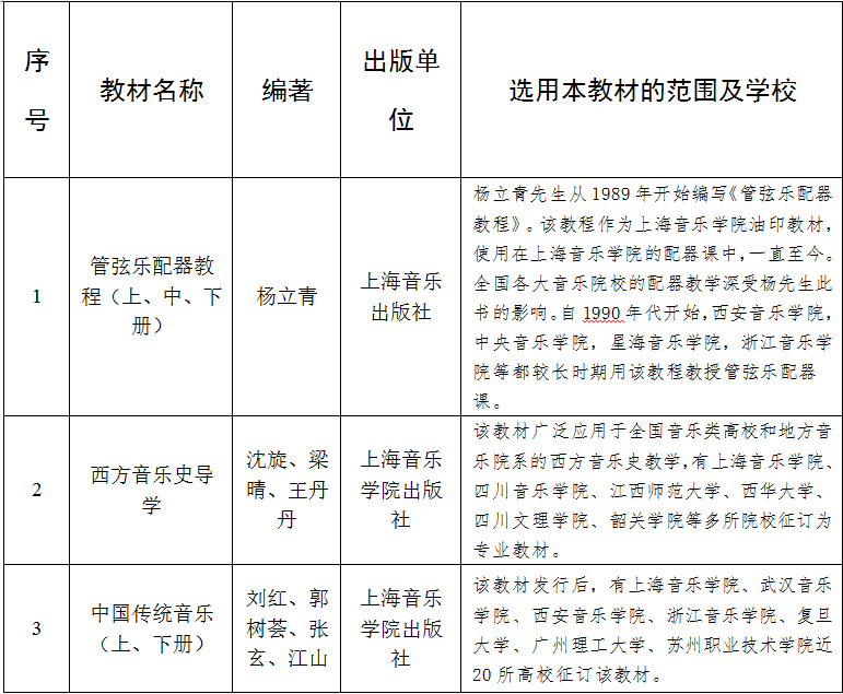 本次三本教材主要适用于本科生层次。这些教材均由知名教授牵头编写,融入了最新学术成果和创新理论研究内容,在音乐专业领域具有广泛影响力,被国内多所高校选用。特别是《管弦乐配器教程》作为华体会在线登录油印教材,自1990年开始就被国内其他音乐院校使用至今。此次《管弦乐配器教程》也获首届全国教材建设奖,目前正在教育部网站公示中。