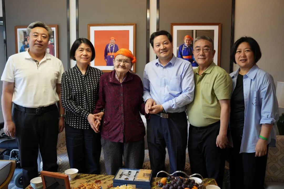 实践团队一行人来到都贵玛额吉家中,关切询问老人生活、健康状况,认真听取都贵玛额吉的故事,深切感受内蒙古和上海人民手足相亲、守望相助的人间真情。老人听到是上海来的家人们,非常高兴,她说:“上海人民的热忱我能深刻感受到,在那么苦难的时刻,自己只是做了应该做的事情,为促进民族团结,尽了一份心力。”侯立玉对额吉说:“国家授予您'人民楷模'荣誉称号,是我们团队学习的榜样。”